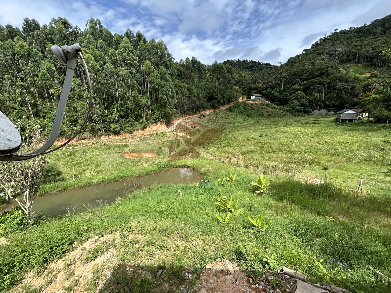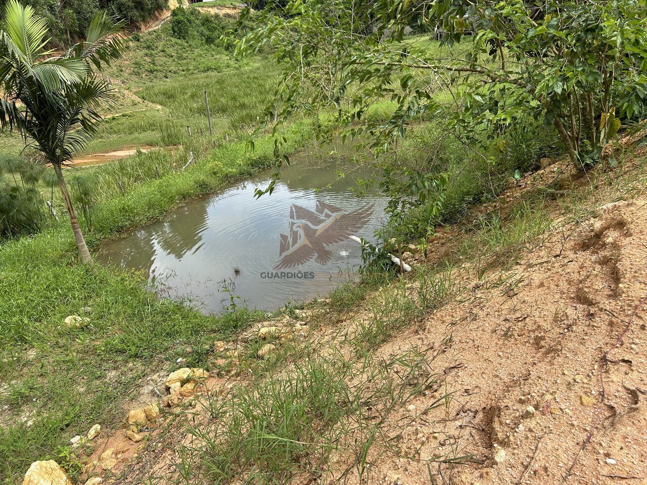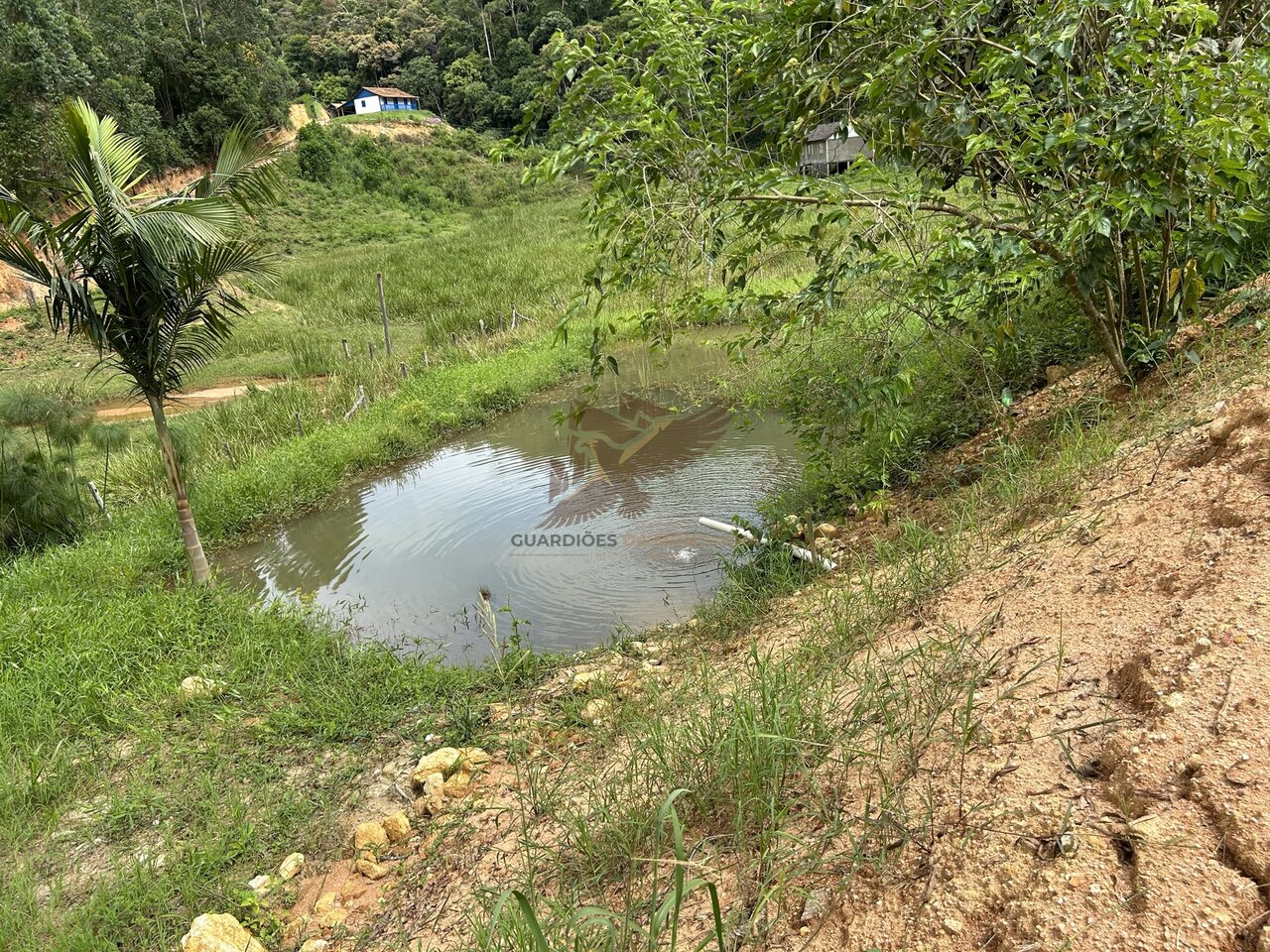 Contém um lago com água de nascente vindo por gravidade do terreno vizinho e água de poço artesiano feito dentro da chácara.