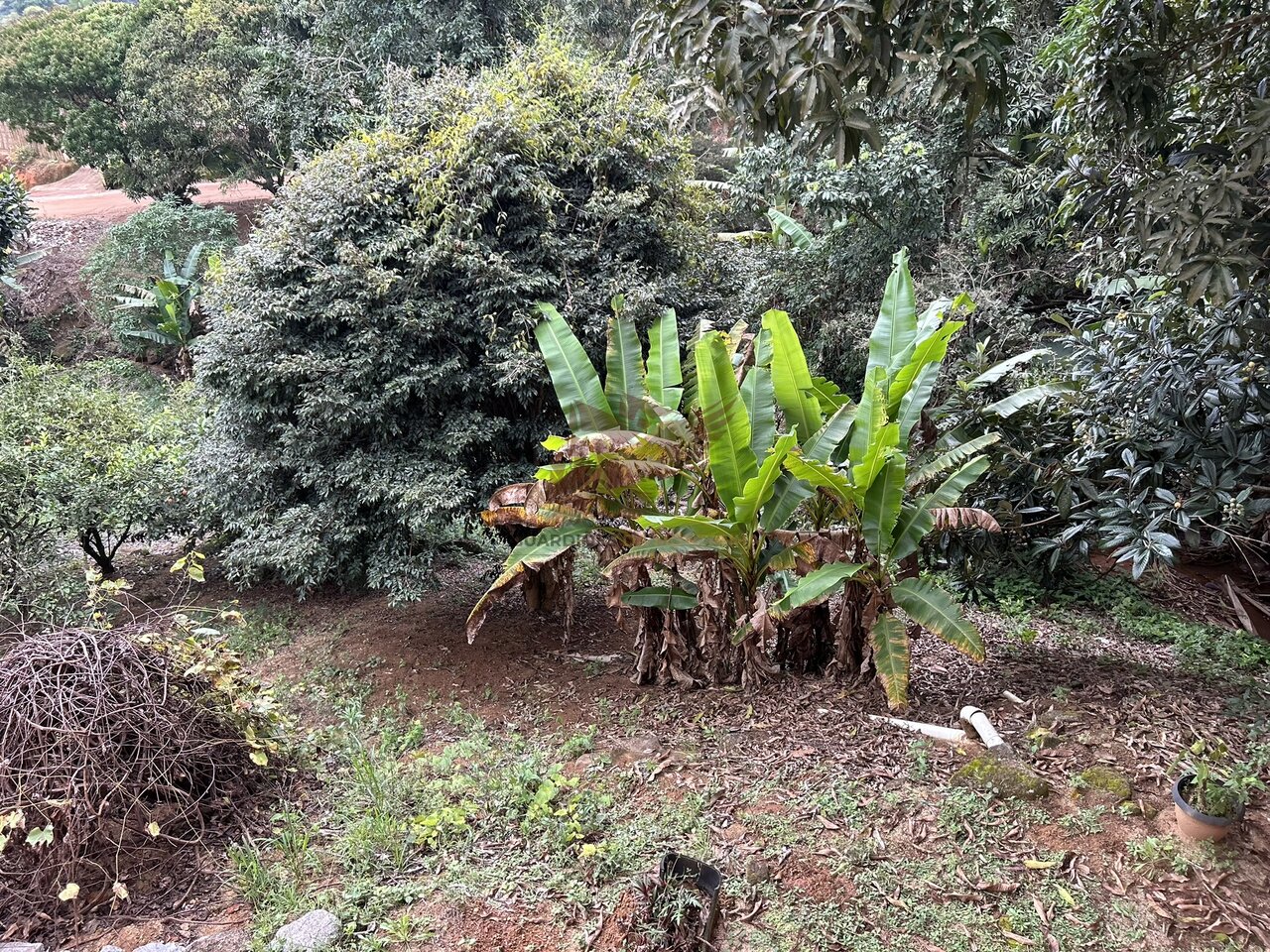Pomar com algumas frutas produzindo e tem espaço pra fazer novas plantações.